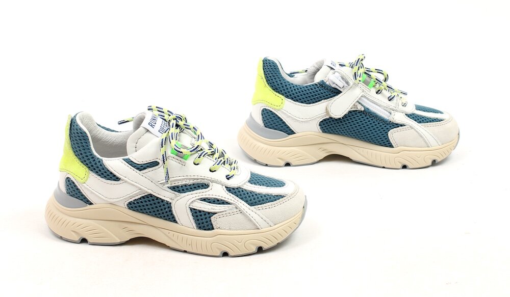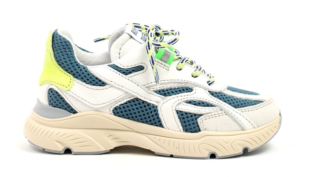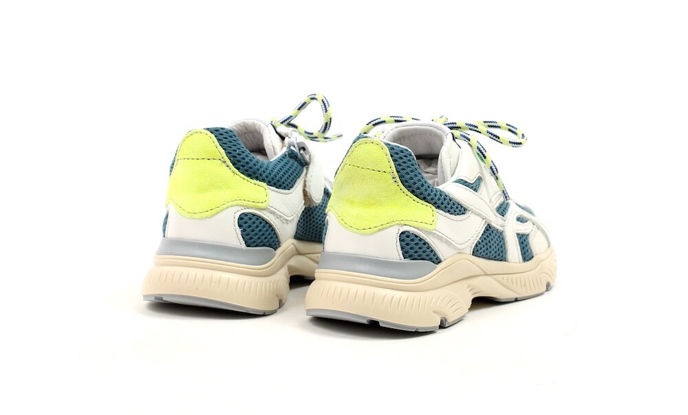 • Kleur: stoere combi van wit & petrolblauw met fluogeel accent